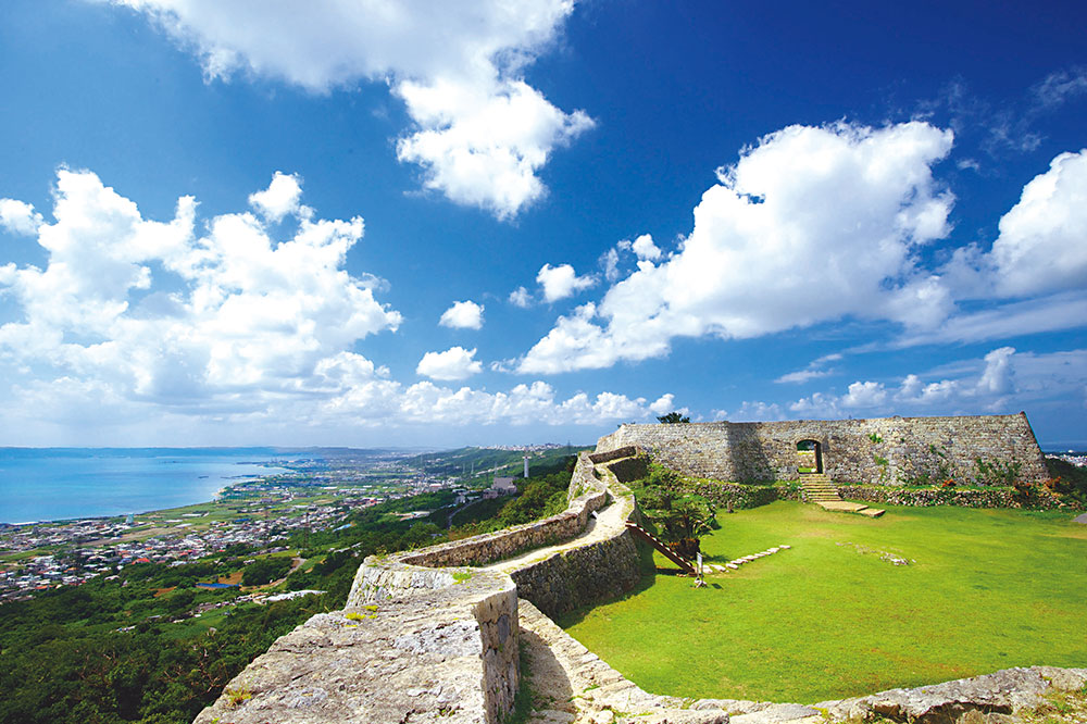 中城城跡は、中城村と北中城村にまたがり東北と南西にほぼ一直線に伸びた標高150m~170mの石灰岩丘陵上に立地する護佐丸の居城として有名です。城は6つの郭からなり、城壁は琉球石灰岩で積まれ、自然の岩石と地形的条件を巧みに生かしながら美しい曲線で構成されおり、アメリカのマシュー・ペリー提督が1853年5月にここを訪ねた彼の一行は城を見て、城壁、アーチの門の建築土木技術水準の高さに驚嘆し、この城に関する詳細な報告文を書いています。